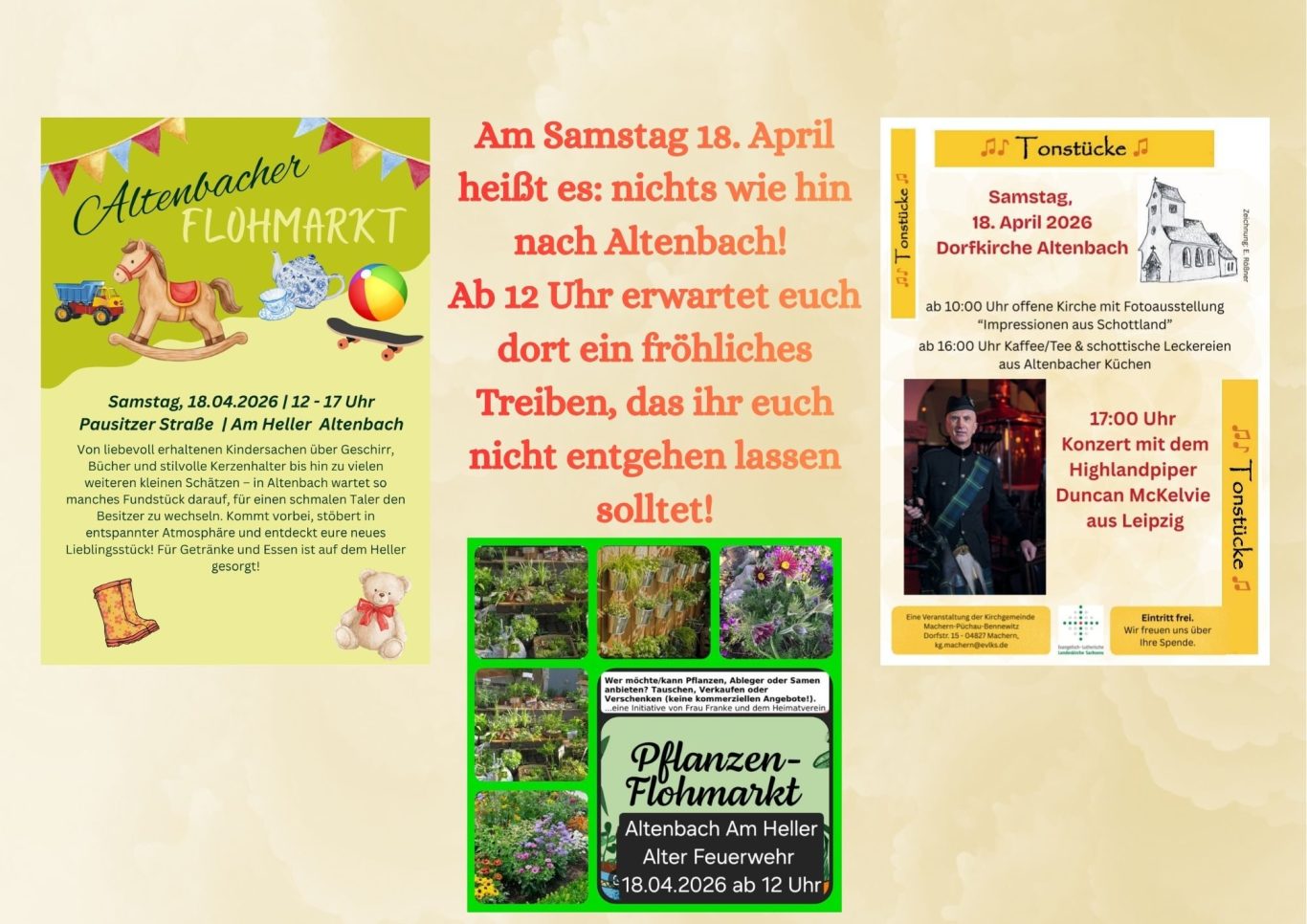 Auch in diesem Jahr findet wieder unser Flohmarkt in der Pausitzer Straße und am Heller statt. Die Pflanzenbörse des Heimatvereins ""Rund um den Eicherberg" wird auch stattfinden. Die Kirchengemeinde "Machern Püchau Bennewitz" lädt ebenfalls in die Altenbacher Dorfkirche zu einem bunten Programm ein. Also save the Date und kommt nach Altenbach.